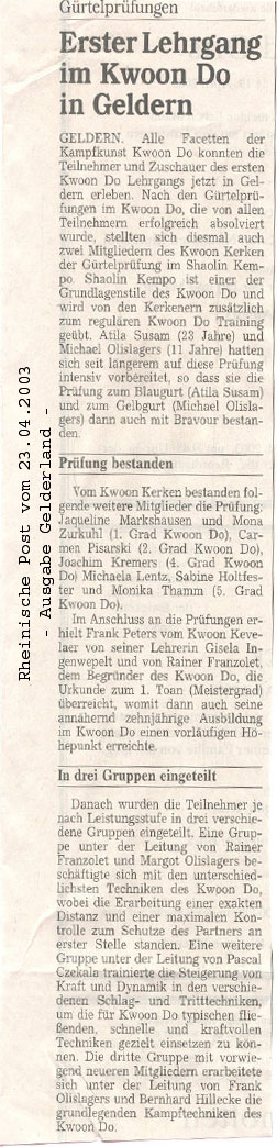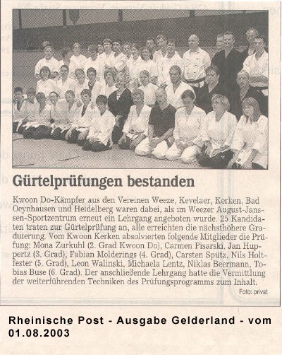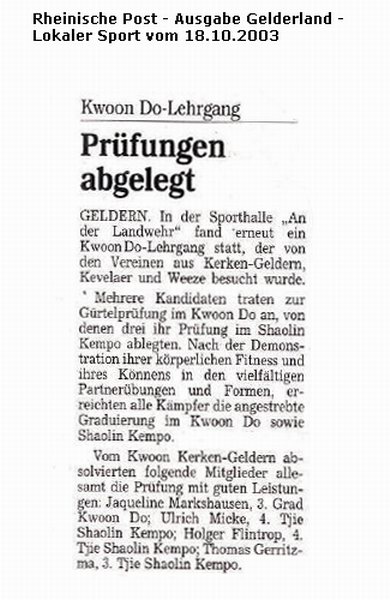 Am Sonntag den 12.10.2003 fand wieder ein Lehrgang in Geldern in der Sporthalle "An der Landwehr" statt, der von