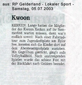 Am Donnerstag, dem 19.06.2003 (Fronleichnam) war es endlich so weit, das lange erwartete Sommerfest 2003 des Kwoon Kerken stand an. Wir trafen uns um 11:00 in Geldern an der Sporthalle "An der Landwehr", um gemeinsam mit dem Rad unter der Führung von Margot Olislagers zum Jugendzeltplatz am Eyller See in Kerken zu fahren. Dort angekommen, belegten wir dann einen überdachten Grillplatz. Während die Erwachsenen das Essen vorbereiteten, das Grillfeuer entfachten und Tische und Bänke aufstellten, konnten sich die Kinder auf dem Abenteuerspielplatz ausgiebig austoben. Nachdem alle Vorbereitungen getroffen waren, wurden die hungrigen Mägen mit den mitgebrachten Salaten und Getränken sowie dem fachkundig von Maik Hillecke zubereiteten Grillfleisch versorgt.